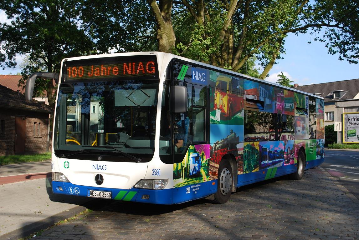 Der Jubiläumsbus inkl. der passenden Anzeige zu "100 Jahre Niederrheinische Verkehrsbetriebe AG"