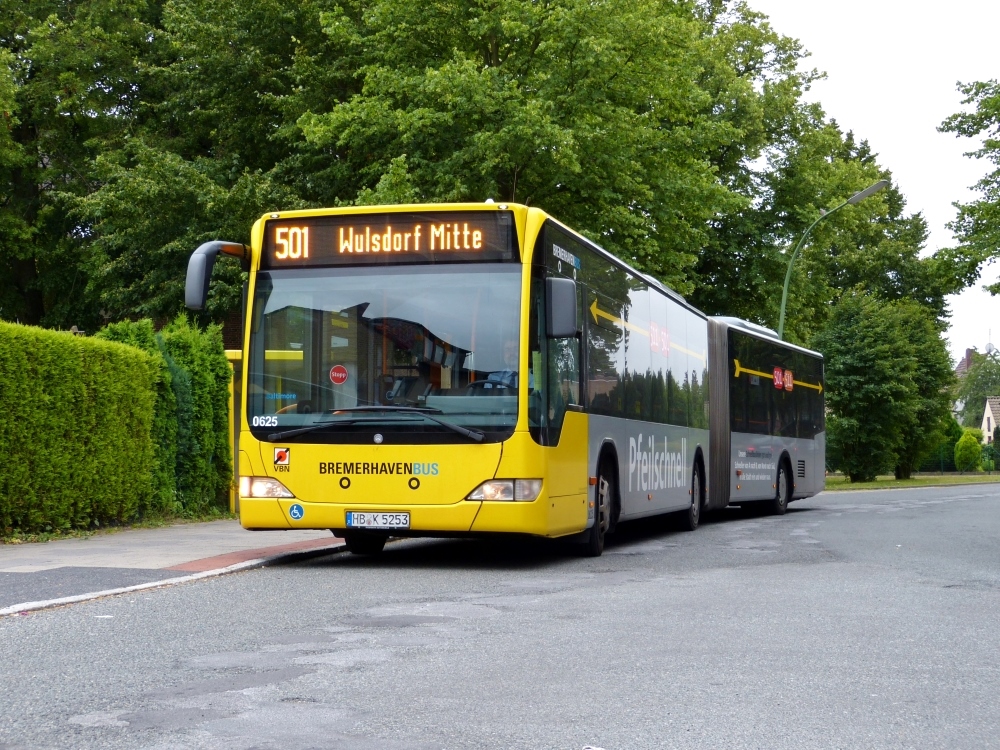 Wagen 0625 der Verkehrsgesellschaft Bremerhaven AG ist hier im Juli 2013 an der Haltestelle Bahnhofstraße zu sehen. Bei dem Bus handelt es sich um einen ehemaligen Vorführwagen von Mercedes. Der Bus trägt noch immer seinen silbernen Lack, lediglich um den typischen gelben Kopf ergänzt. Von 2007 (damals kam der 06er Facelift nach Bremerhaven) bis Ende 2013 wurde die Farbe als Untergrund für eine Eigenwerbung genutzt, seither ist der silberne Lack leider größtenteils unter einer neuen, gelben, Vollwerbung verschwunden. Doch auch weiterhin zeugt der Innenraum mit orangenen Haltestangen und blauen Sitzpolstern von seiner Vergangenheit.
